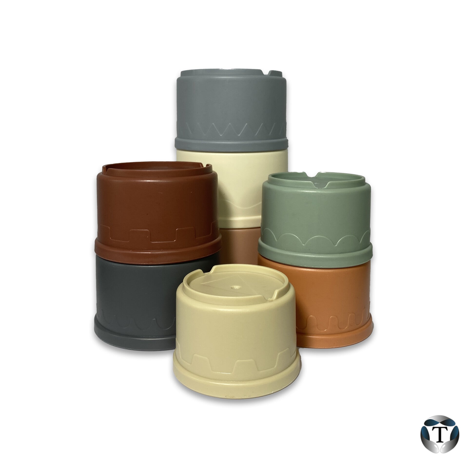 De stapeltoren bestaat uit 8 bekers met verschillende kleurtjes en patronen.